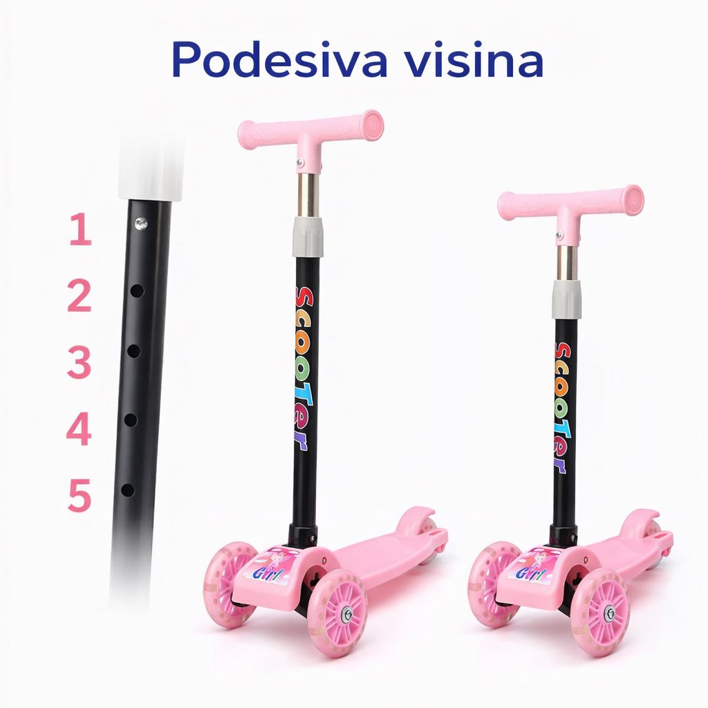 Dječiji trotinet romobil sa svijetlećim točkićima odličan je za djecu koja prvi put koriste ovakav tip vozila. Lagan je, jednostavan za korištenje i prilagođen mališanima koji tek uče osnove vožnje.