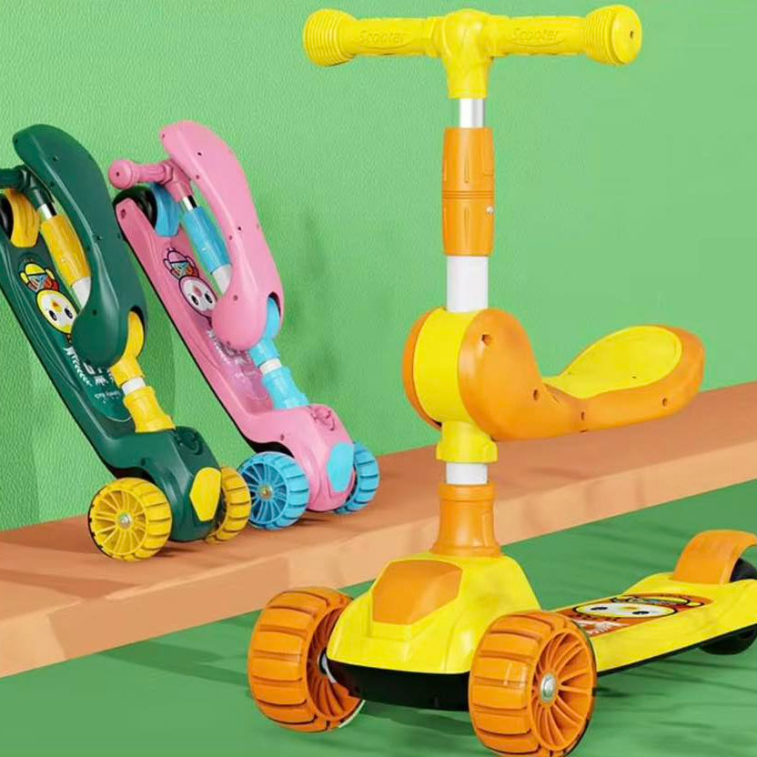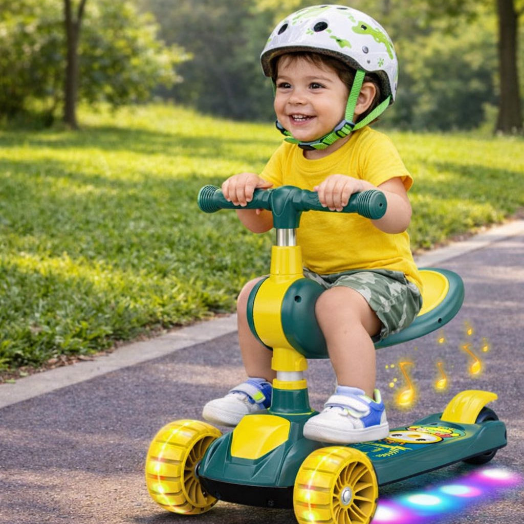 Dječiji trotinet sa sjedištem osmišljen je tako da odgovara različitim fazama odrastanja. U početku ga dijete može koristiti sjedeći, a kasnije kao klasični trotinet za vožnju u stojećem položaju.